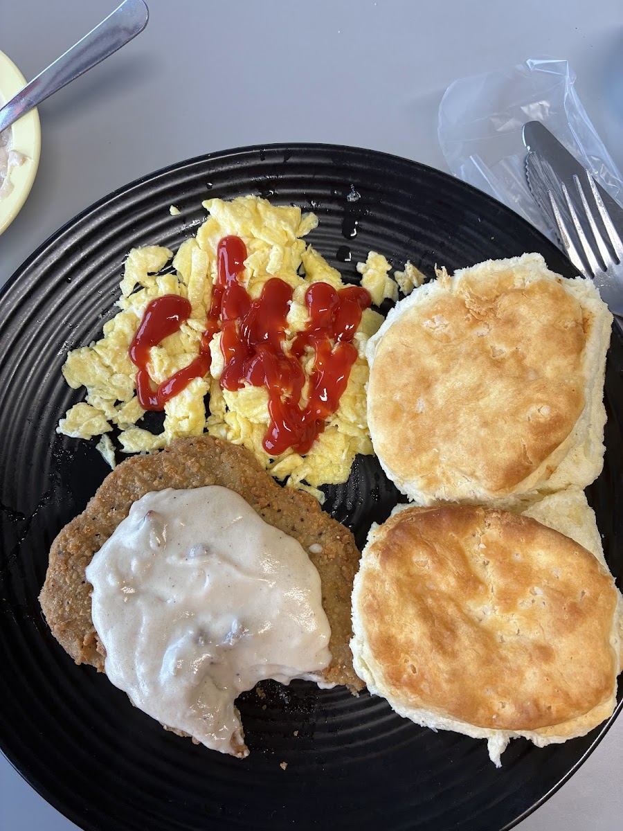 - 1 Egg with Bacon or Sausage, accompanied by a fluffy Biscuit & Gravy
